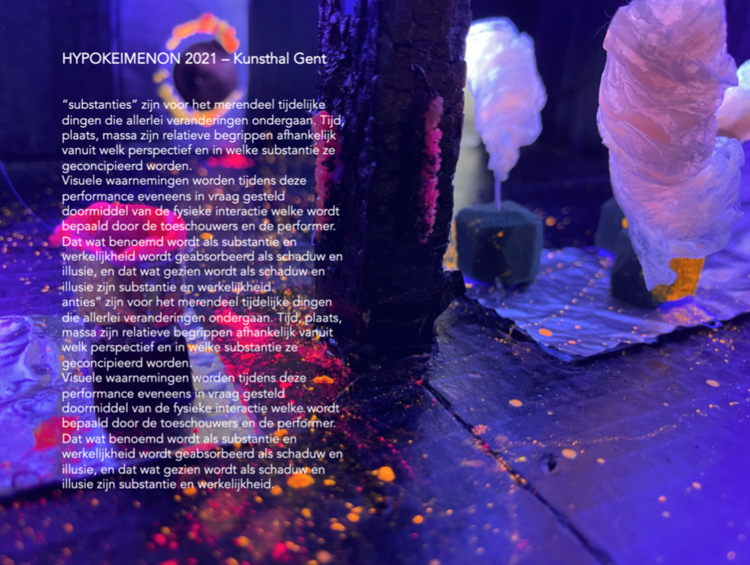Substanties zijn voor het merendeel tijdelijke dingen die allerlei veranderingen ondergaan. Tijd, plaats, massa zijn relatieve begrippen afhankelijk vanuit welk perspectief en in welke substantie ze geconcipieerd worden.Visuele waarnemingen worden tijdens deze performance eveneens in vraag gesteld door middel van de fysieke interactie welke wordt bepaald door de toeschouwers en de performer.