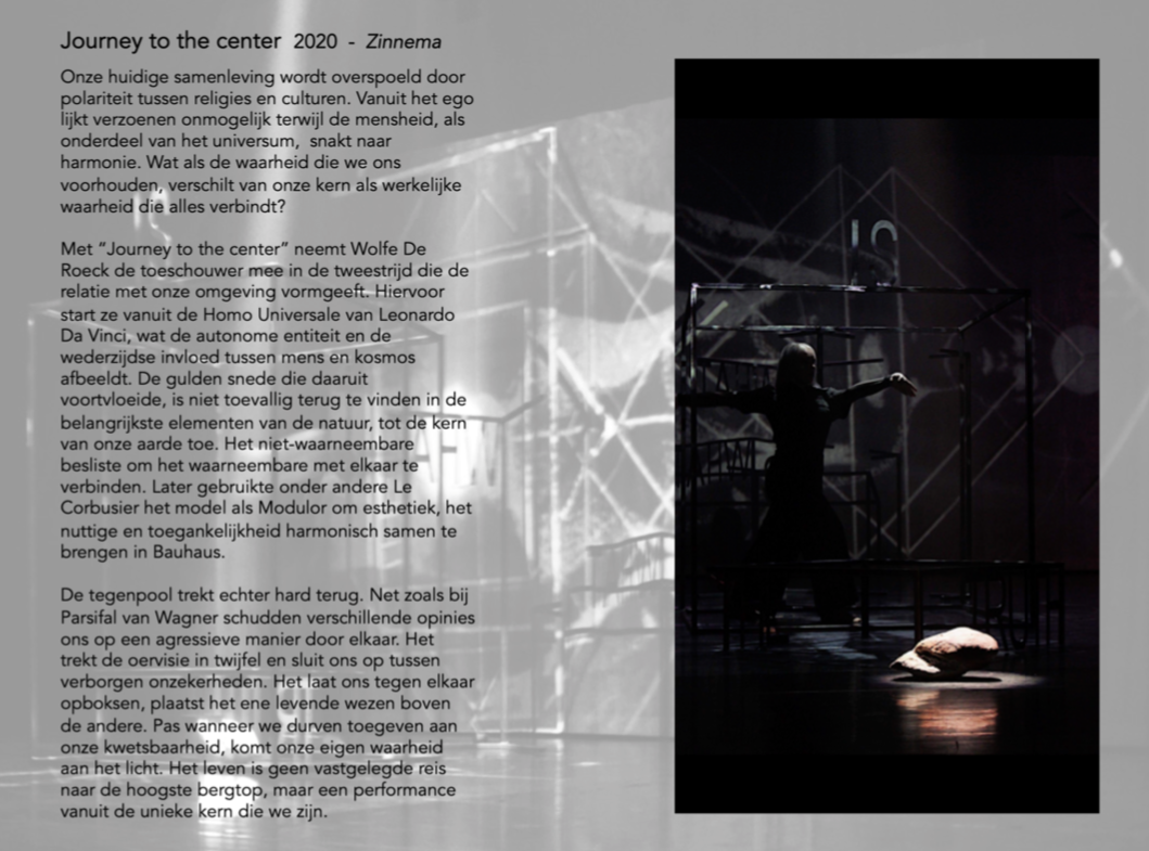 “Journey To The Center” neemt de toeschouwer mee in de tweestrijd die de relatie met onze omgeving vormgeeft. Hiervoor start Wolfe De Roeck vanuit de Homo Universale van Leonardo Da Vinci, wat de autonome entiteit en de wederzijdse invloed tussen mens en kosmos afbeeldt. Het niet-waarneembare besliste om het waarneembare met elkaar te verbinden.